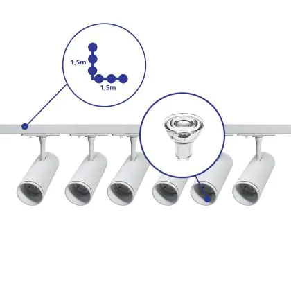 Komplettset 1-Phasen Rail L 1,5 x 1,5 Meter Weiß | incl. 6x Spot + GU10 2700K 3W Dimmbar + Abschlusskappe, Stromanschluss und L -Verbinder