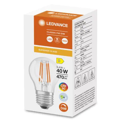 Cette ampoule Ledvance Superior Classic LED E27 Boule Filament Claire 3.4W 470lm - 940 | Dimmable - Meilleur rendu de couleur est l’alternative idéale pour la remplacement de votre ampoule classique de 40 W. La technologie LED intégrée vous offrira de nombreux avantages. Les ampoules à incandescence traditionnelles ont une durée de vie limitée. Cette alternative LED vous permettra de profiter d’un éclairage durable et fiable.