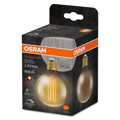 Cette ampoule Ledvance Vintage 1906 LED E27 Globe Dorée 8.8W 806lm - 822- | Dimmable - Remplacement 60W avec son efficacité lumineuse de lumen par watt vous permettra de profiter d’un éclairage de qualité. Avec sa durée de vie de 15000 heures, vous n’aurez pas à vous soucier de son remplacement avant quelques années.