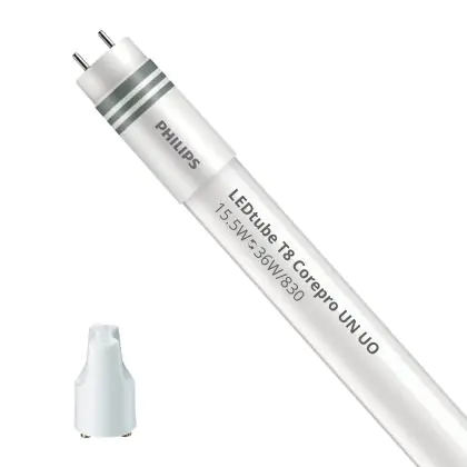 Ce tube LED Philips LED Tube T8 CorePro (UN) Ultra Output 15.5W 2200lm - 830 Blanc Chaud | 120cm - Équivalent 36W est l’un des produits les plus éconergétiques en remplacement des tubes T8 classiques. Avec ce tube LED vous êtes donc assuré de sa qualité. Avec une puissance de seulement 15.5 W, ce tube LED a la même intensité lumineuse qu’un tube classique qui consomme 36 W. P>